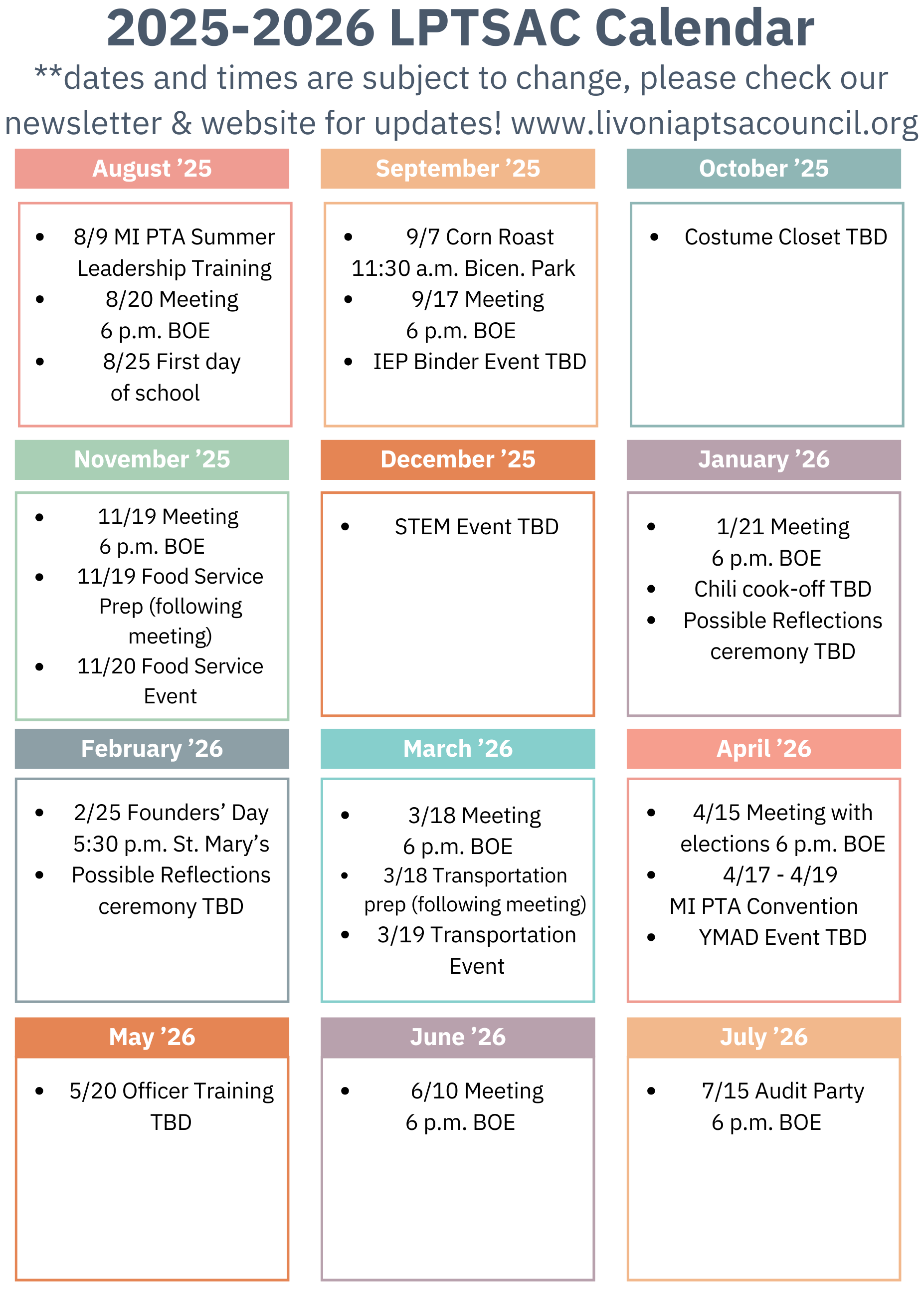 Please see our upcoming meetings and events below. Council generally meets on the THIRD WEDNESDAY of the month. PTA suggests the following meeting schedule for Units to minimize meeting/date conflicts: