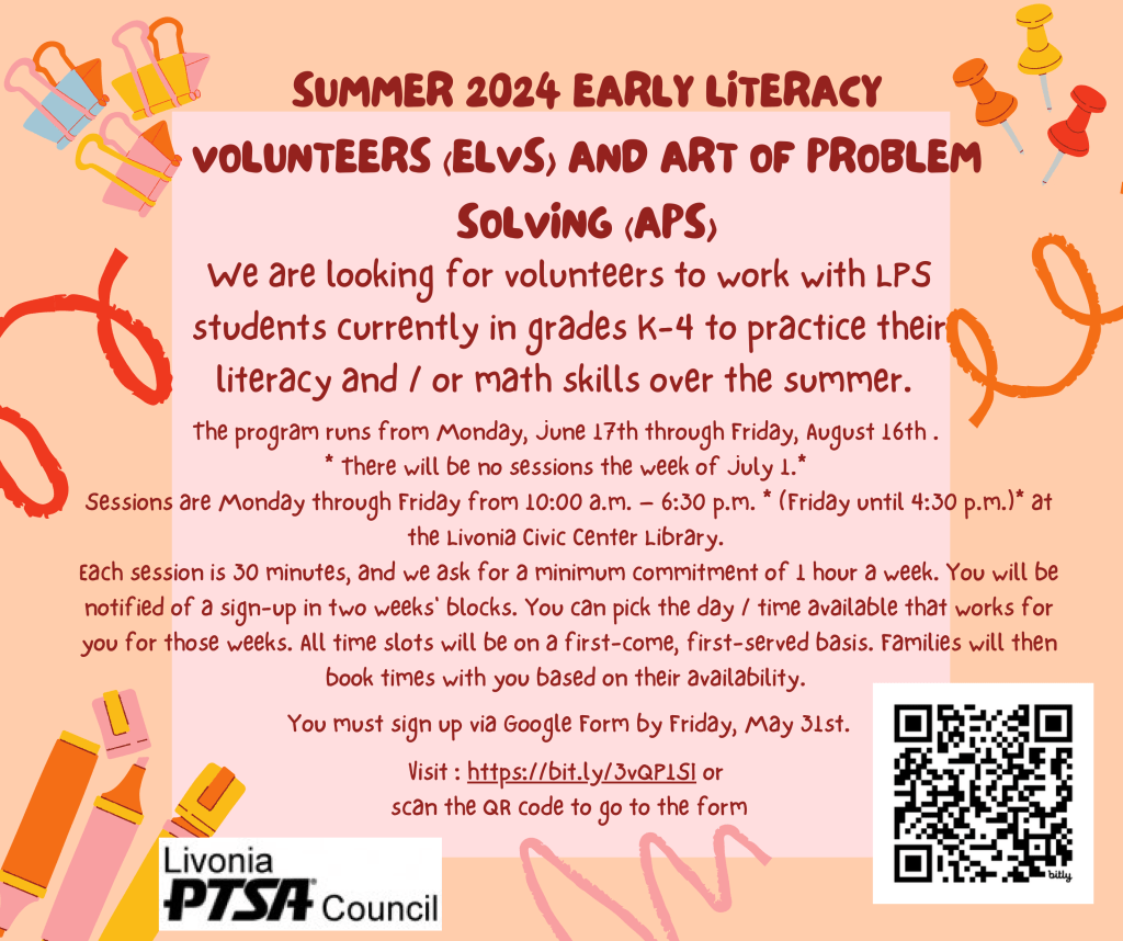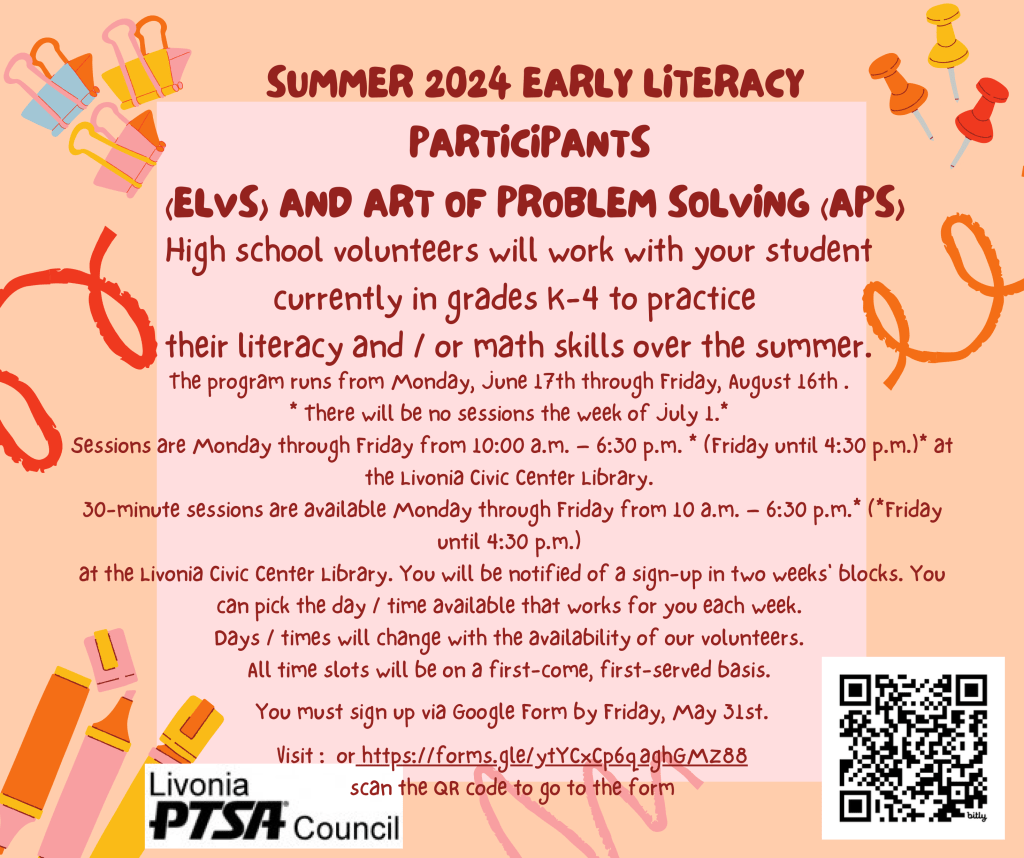 This program is offered to LPS students currently in grades K-4 who want to practice their literacy and / or math skills over the summer. Students will work with a high school volunteer from June 17 – August 16 (no session the week of July 1) at the Livonia Civic Center in a weekly, 30-minute session. There is no cost to participate in the program.